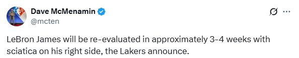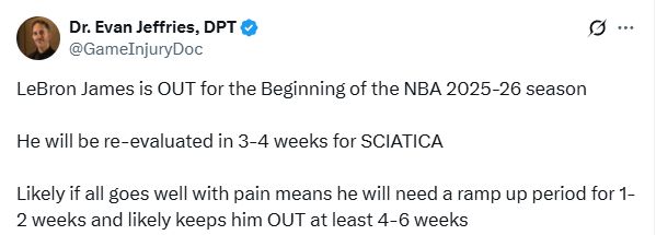 医学专家Evan Jeffries表示,詹姆斯将缺席2025-26赛季初期的比赛,他将在3-4周后重新评估坐骨神经痛,如果一切顺利,疼痛可能需要1-2周的恢复期,并且可能至少需要4-6周的时间才能康复。
